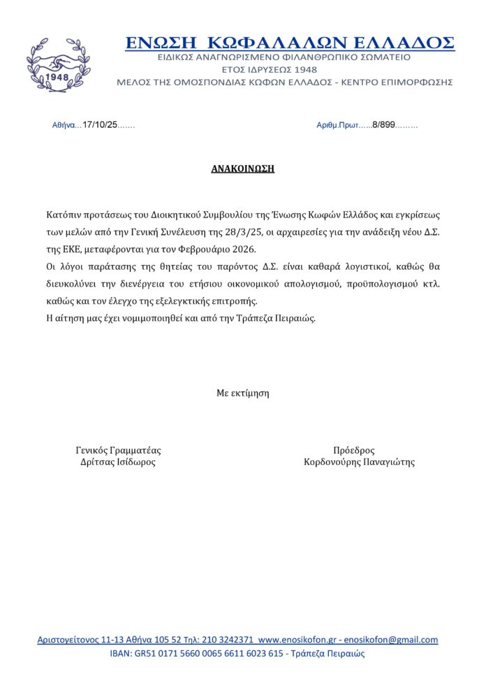 Κατόπιν προτάσεως του Διοικητικού Συμβουλίου της Ένωσης Κωφών Ελλάδος και εγκρίσεως των μελών από την Γενική Συνέλευση της 28/3/25, οι αρχαιρεσίες για την ανάδειξη νέου Δ.Σ. της ΕΚΕ, μεταφέρονται για τον Φεβρουάριο 2026.