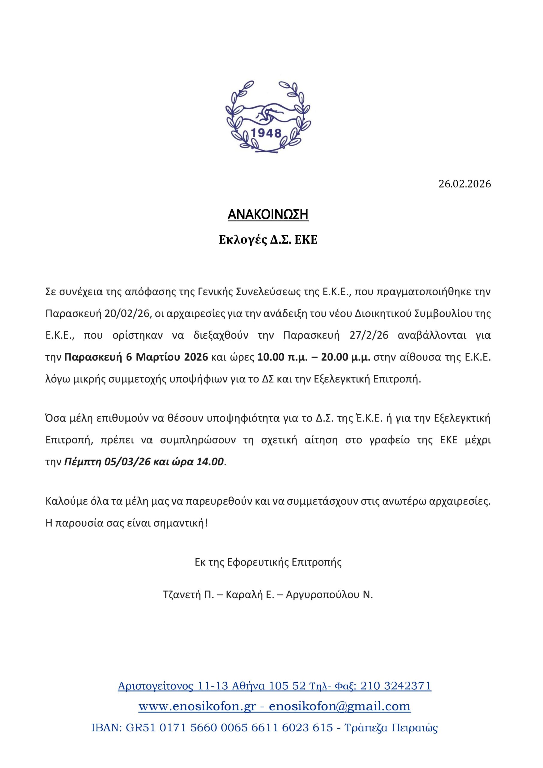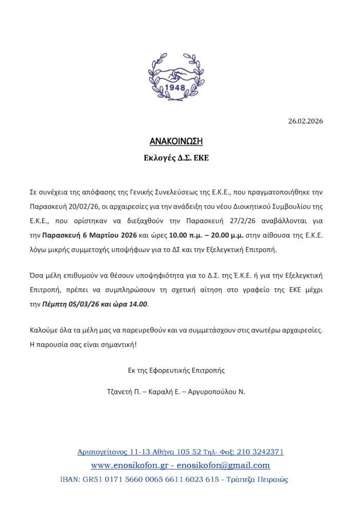 Σε συνέχεια της απόφασης της Γενικής Συνελεύσεως της Ε.Κ.Ε., που πραγματοποιήθηκε την Παρασκευή 20/02/26, οι αρχαιρεσίες για την ανάδειξη του νέου Διοικητικού Συμβουλίου της Ε.Κ.Ε., που ορίστηκαν να διεξαχθούν την Παρασκευή 27/2/26 αναβάλλονται για την Παρασκευή 6 Μαρτίου 2026 και ώρες 10.00 π.μ. – 20.00 μ.μ. στην αίθουσα της Ε.Κ.Ε. λόγω μικρής συμμετοχής υποψήφιων για το ΔΣ και την Εξελεγκτική Επιτροπή.